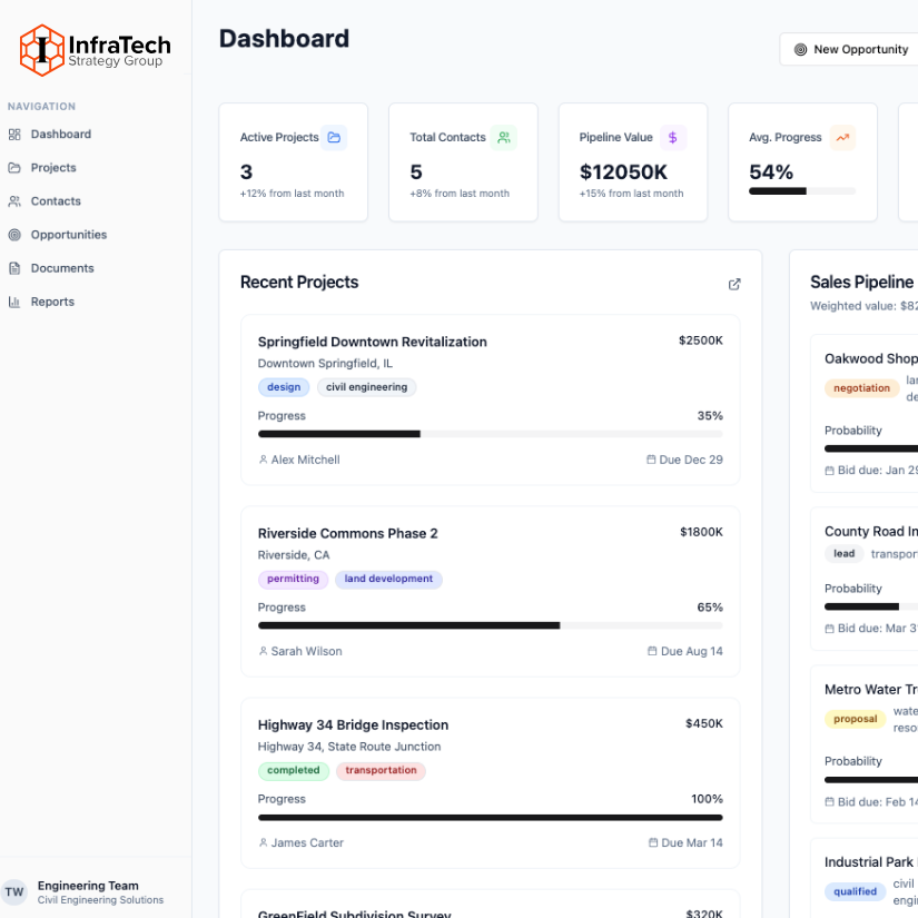 Custom-built CRM, proposal, and reporting systems designed around real engineering workflows.